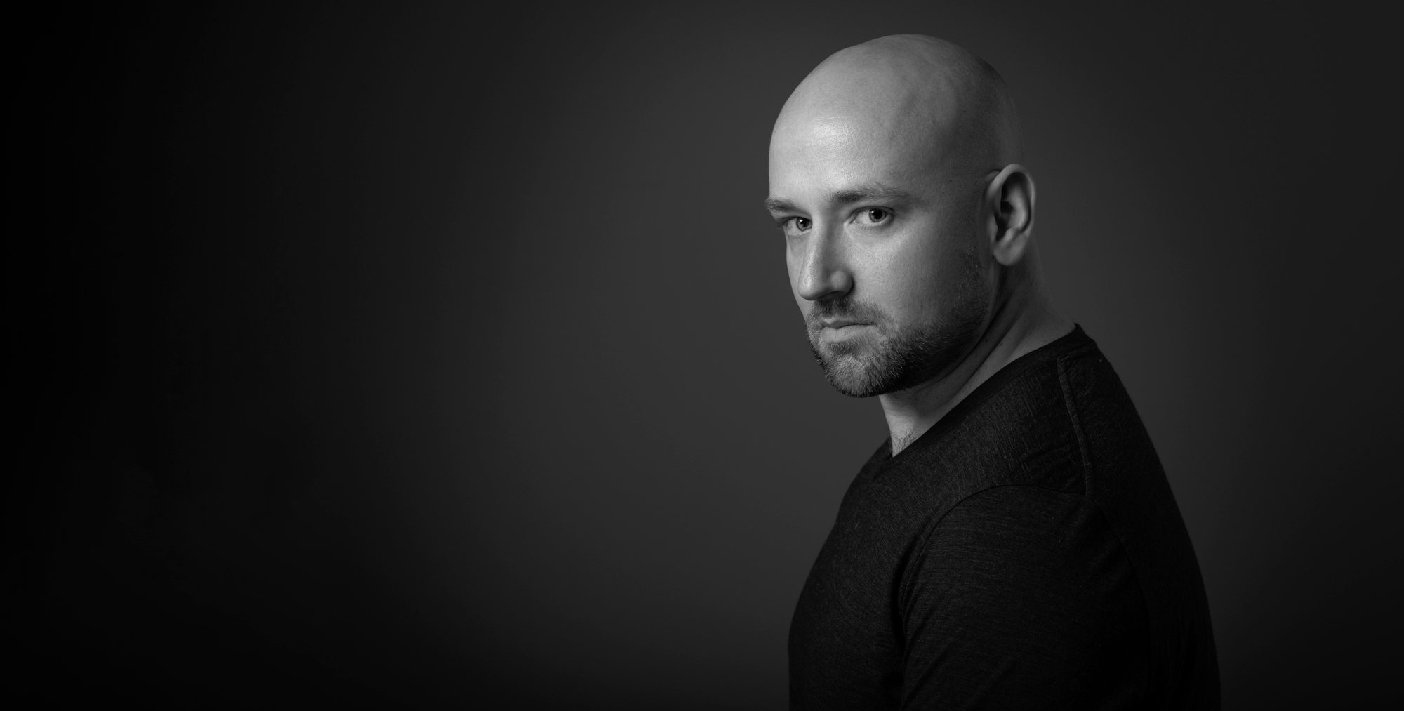Serious actor headshot of melbourne man taken on dark background in studio.